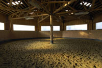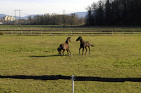 dvě osvětlené pískové jízdárny, hala, krytá kruhovka, solárium pro koně, výběhy.